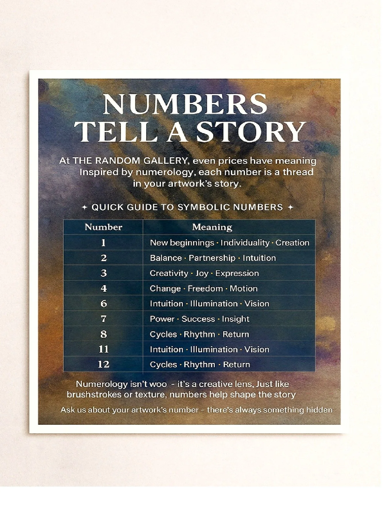 Here, art meets numerology through Artology — a one-of-a-kind pricing system where every artwork is priced by a random number generator. It’s our way of making art more accessible, surprising, and democratic.