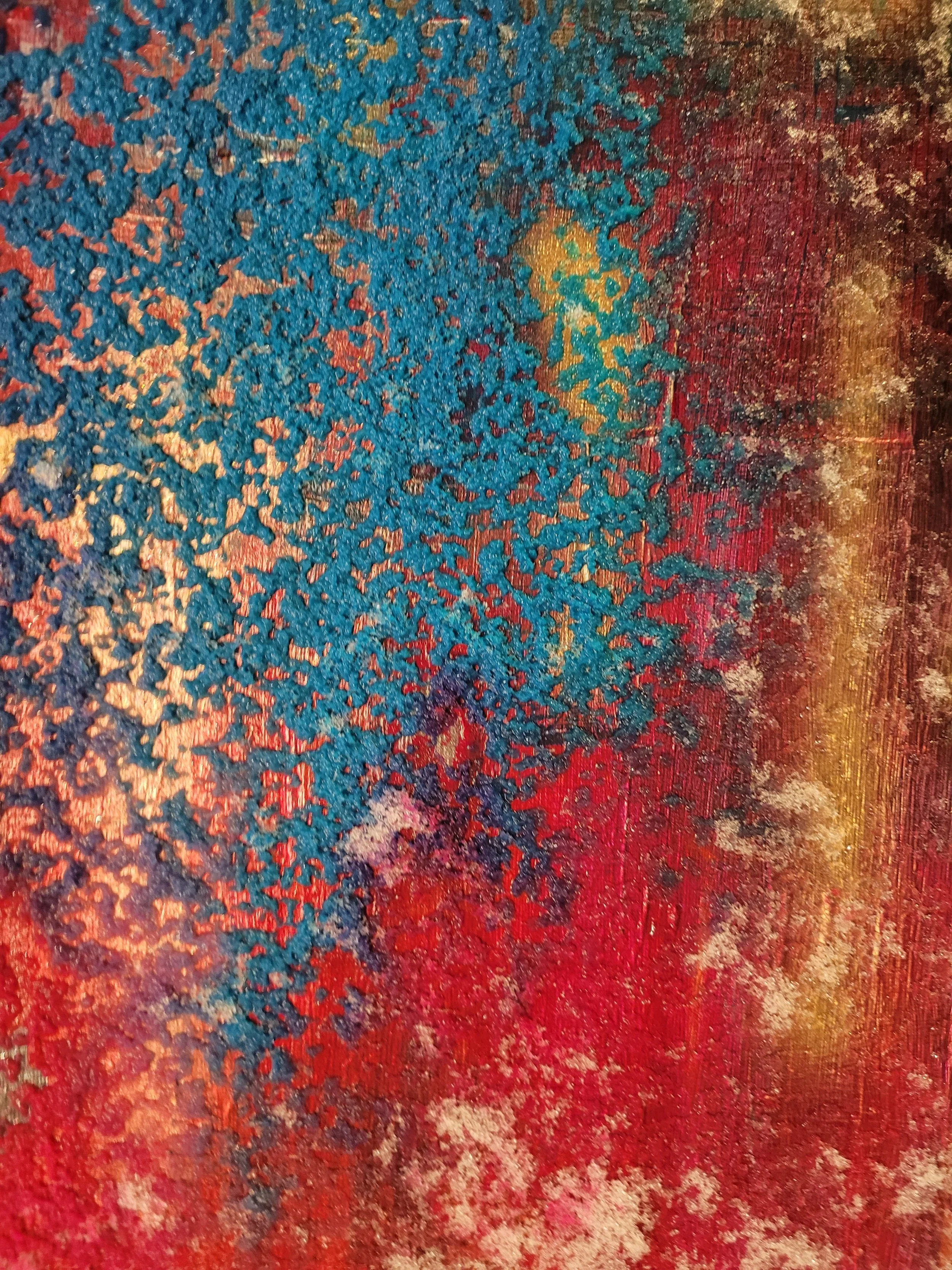 The swirling red haze, suspended within the cold surface, gives the work its name and mood. It's a painting that doesn’t just depict nature — it is nature, transformed through human touch. As the elements shift and settle, they remind us that nothing lasts — and that’s what makes it beautiful.